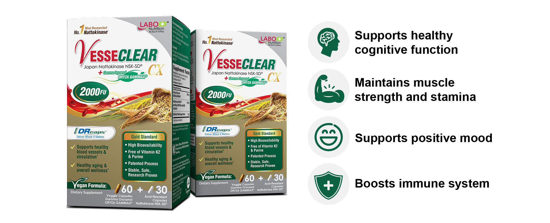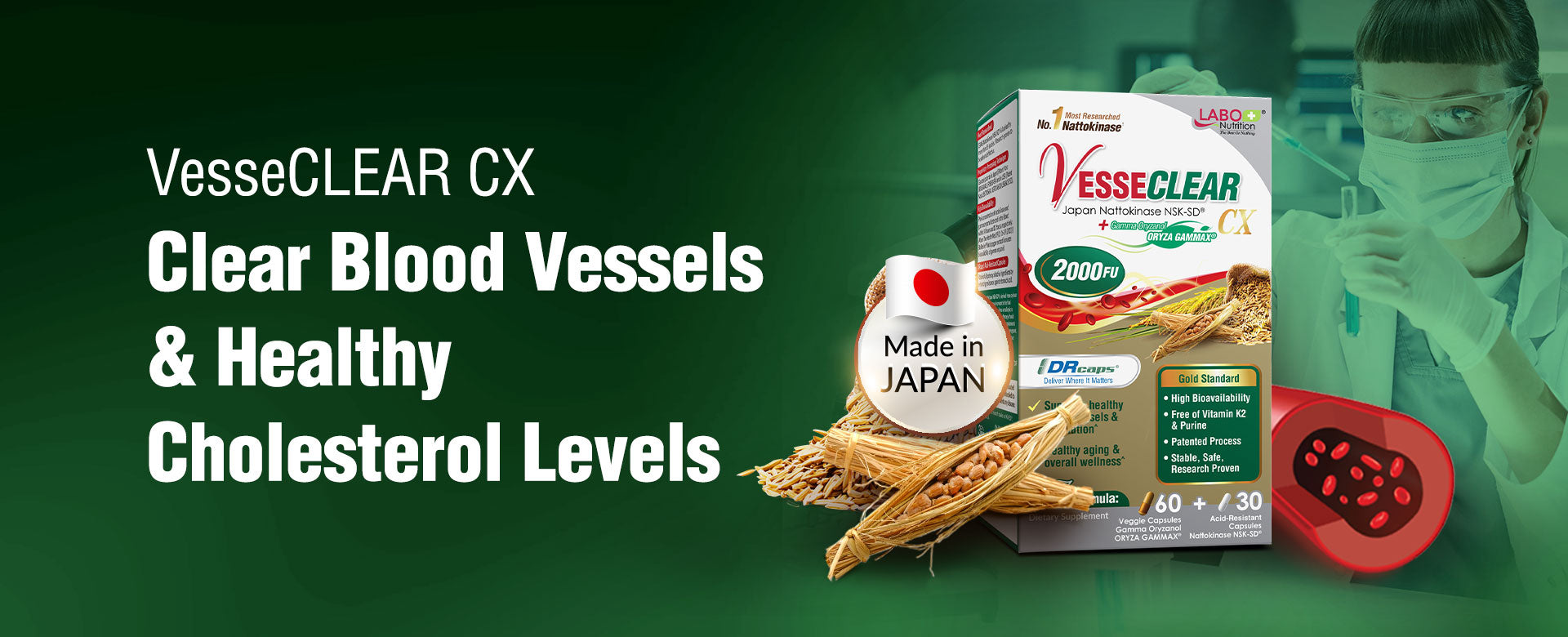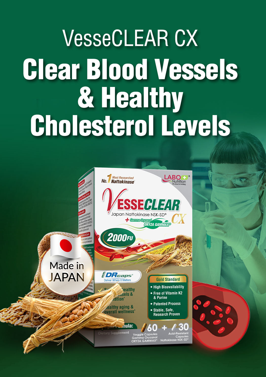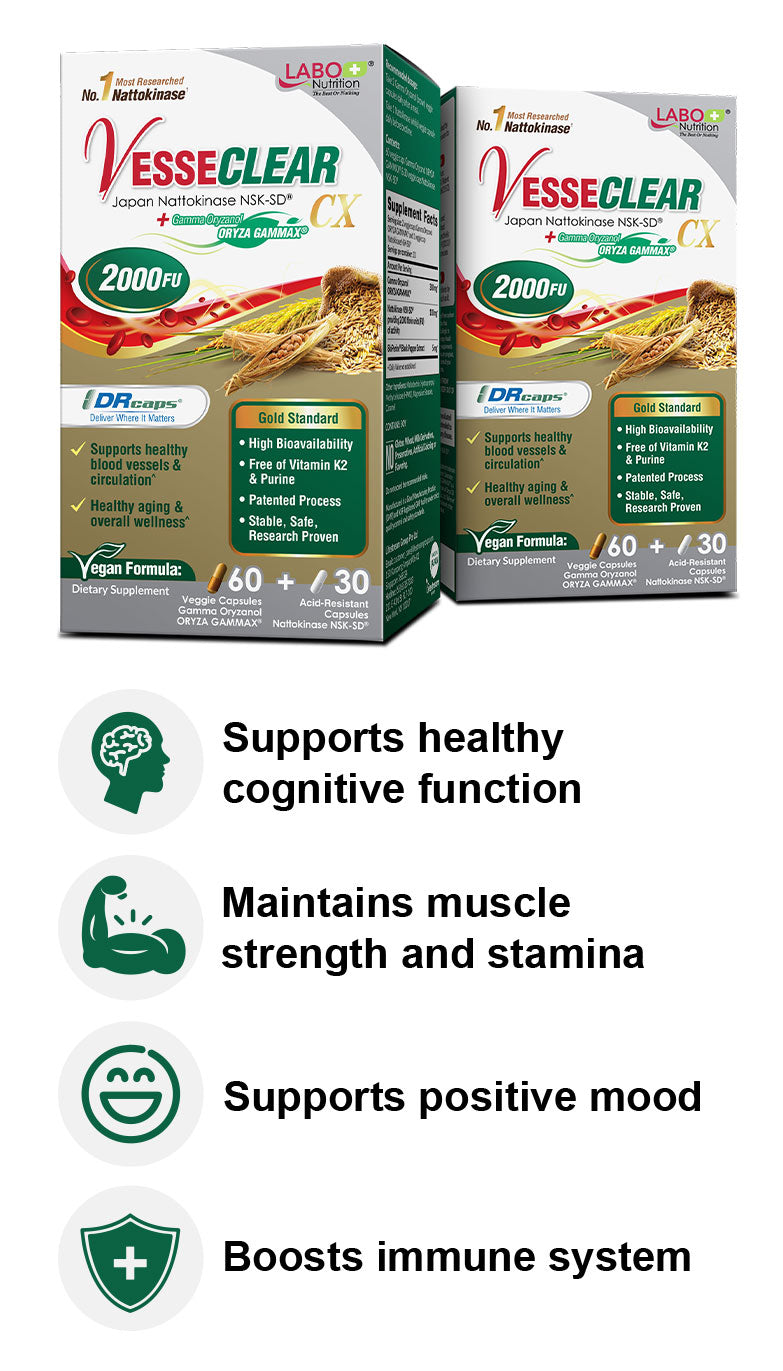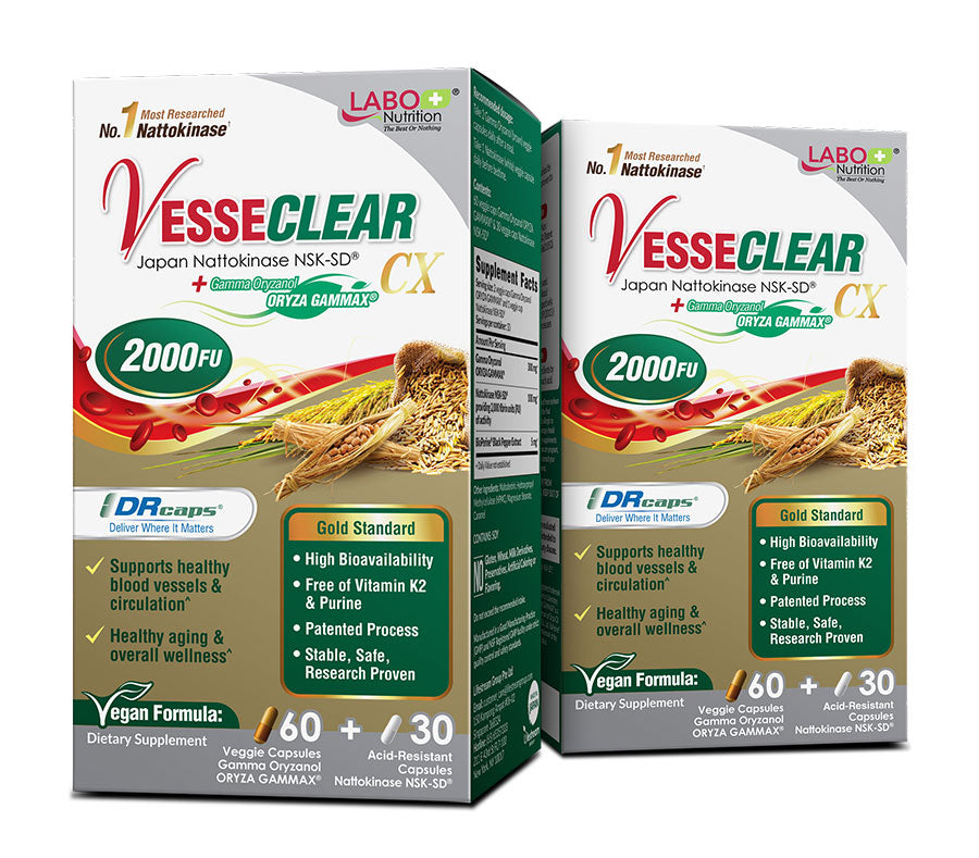 LABO Nutrition VesseCLEAR CX: Artery Cleanse Supplement to Support Blood Pressure, Clean Blood Vessel, Heart & Cholesterol Health Formula | Nattokinase NSK-SD + Gamma Oryzanol | Vegetarian DR Capsules