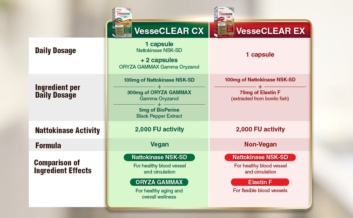 VesseCLEAR EX is made from 100% pure concentrated Nattokinase NSK-SD®, developed by Japan Bio Science Laboratory (JBSL), pioneers in nattokinase research. It is enhanced with Elastin F (1,000× more flexible than collagen) to maintain elastic, supple blood vessels and smooth circulation.