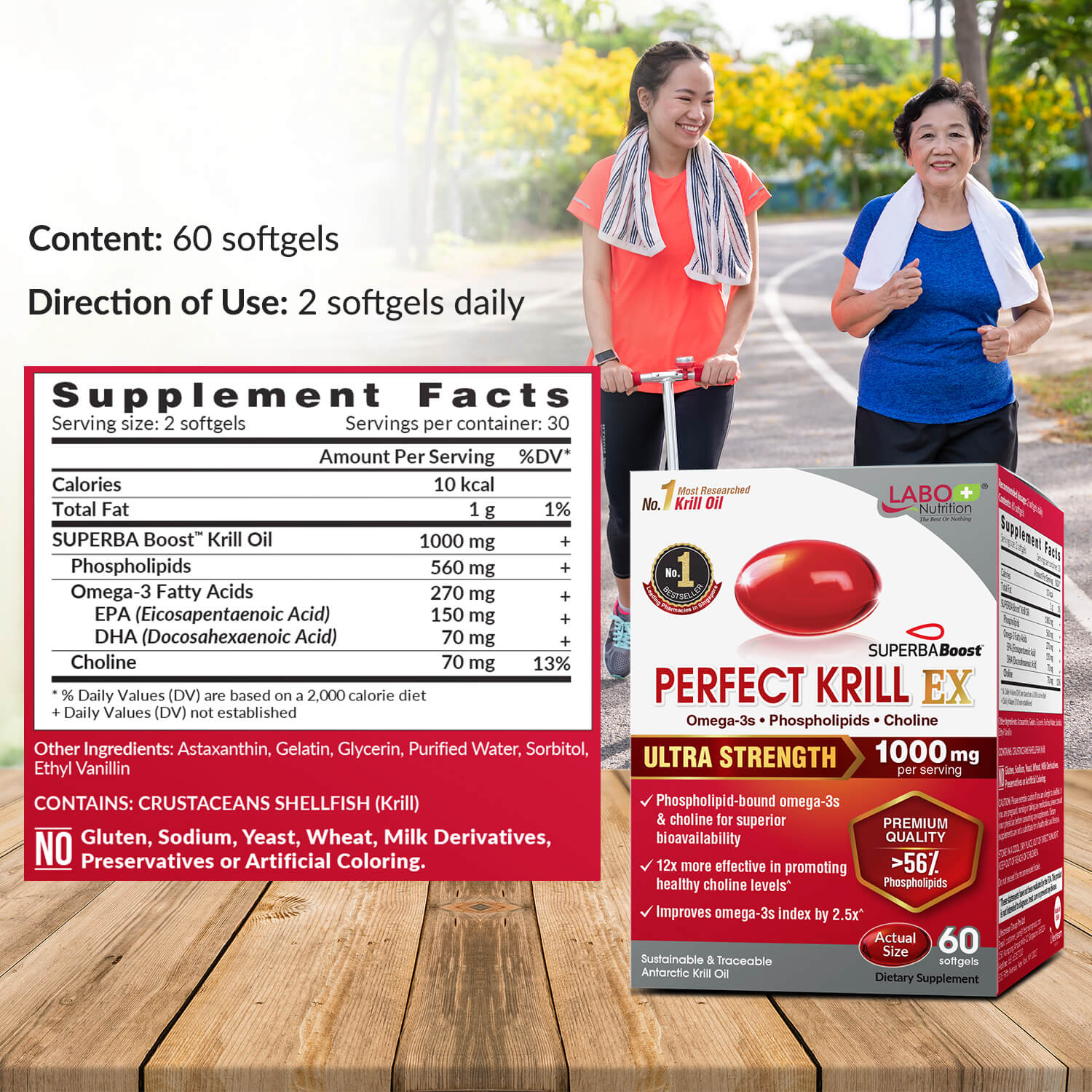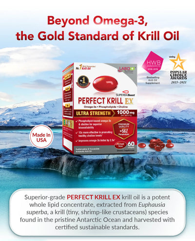 Active Ingredients: 1000mg SUPERBA Boost™ Krill Oil (contains 560mg Phospholipids, 270mg Omega-3 Fatty Acids (EPA and DHA) & 70mg Choline