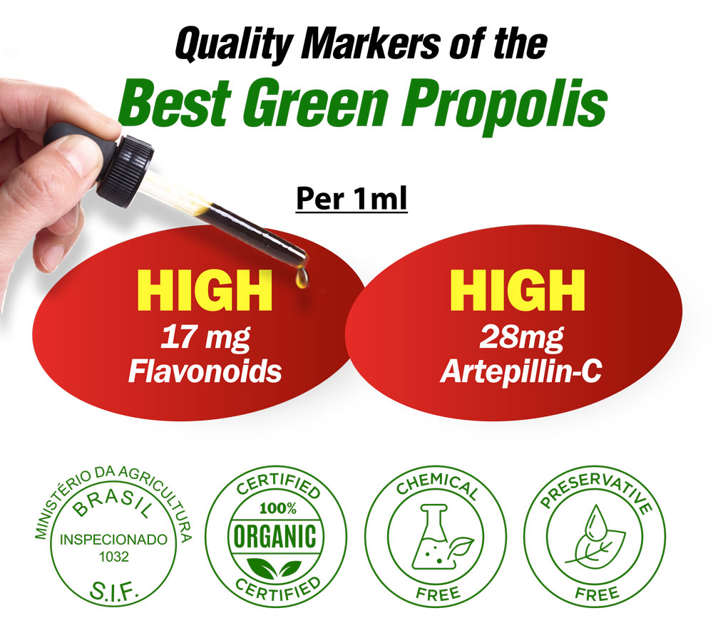 • Contains over 28mg/ml (2.8%) Artepillin-C, a key marker of superior Green Propolis quality.