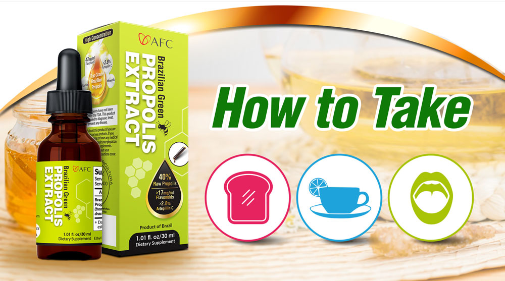 • Hold some water in your mouth, drip propolis and hold in the mouth for 1 minute before swallowing to increase its absorption into the bloodstream via the gums
