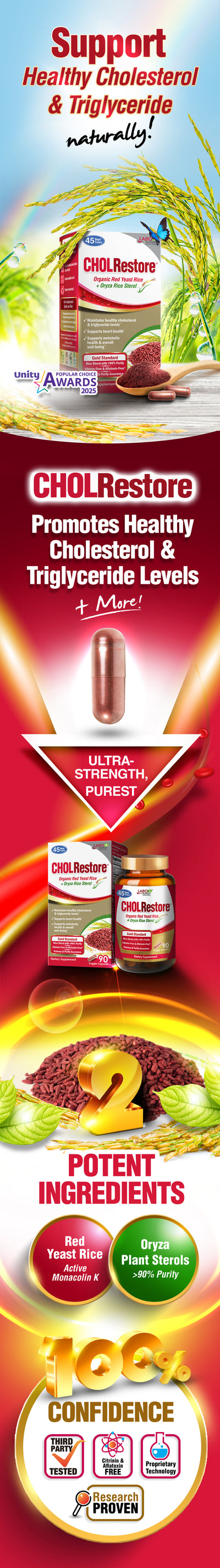 CHOLRestore is formulated with the top grade, most purified red yeast rice, with naturally-derived monacolin K in active open loop, which can be utilized easily by the body with less conversion, thereby supporting healthy cholesterol level without taxing the liver. Meanwhile, monacolin K in other red yeast rice supplements is in inactive closed loop form, which requires conversion to an active form before being absorbed and utilized to support healthy cholesterol levels. Also, the premium grade organic red yeast rice used in CHOLRestore is fermented using cutting-edge technology, which yields high amounts of naturally-occurring bioactive compounds.