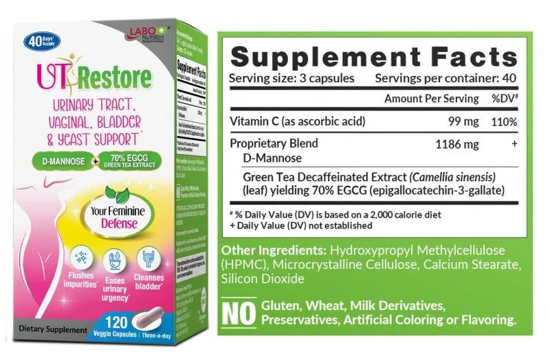 UTRestore combines D-mannose and green tea extract standardised with 70% EGCG to reduce UTI risk by blocking bacteria from sticking to the urinary tract, break up bacterial biofilms, which can protect bacteria from antibiotics and weaken bacteria colonies in these biofilms. This approach helps prevent and manage UTIs naturally.