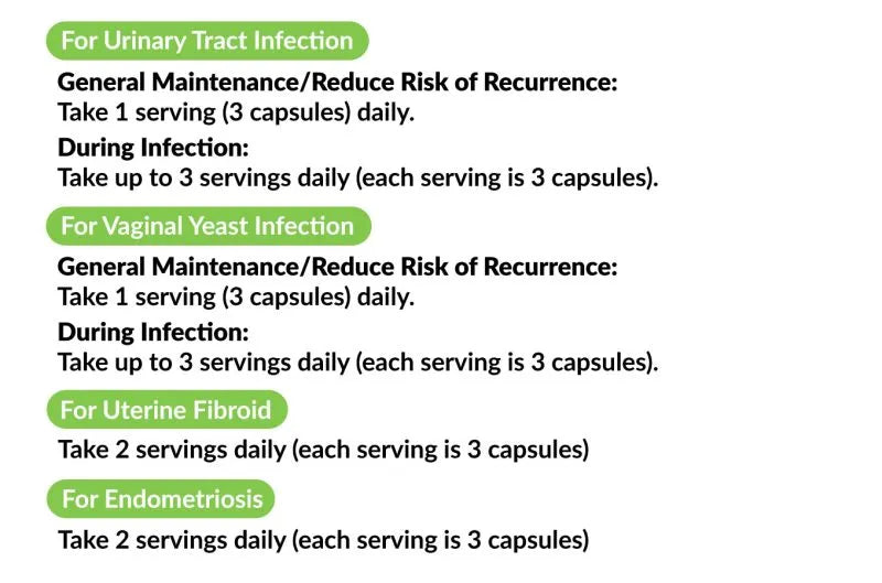 For general prevention, take 3 capsules (1 serving), once daily. For active UTIs, take 3 capsules (1 serving), three times daily until symptoms ease, then continue with one serving daily to reduce the risk of recurrence.