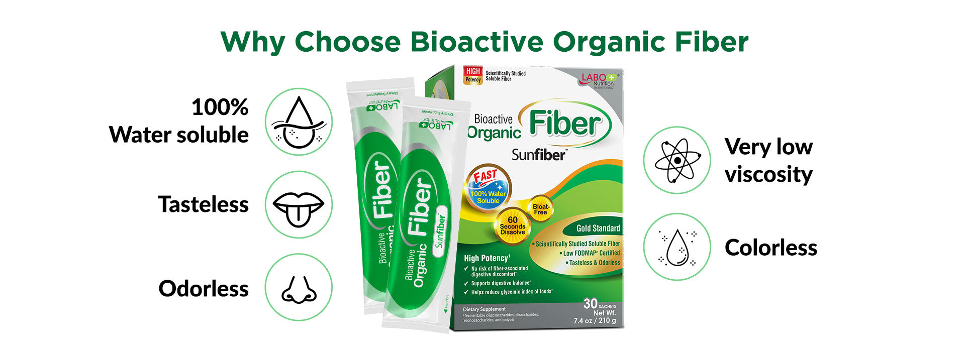 Bioactive Organic Fiber is formulated with Sunfiber (Partially Hydrolyzed Guar Gum), a 100% water soluble, all natural, gluten-free prebiotic dietary fiber. Unlike other fibers, Sunfiber closes the fiber gap without the excess gas or bloating.