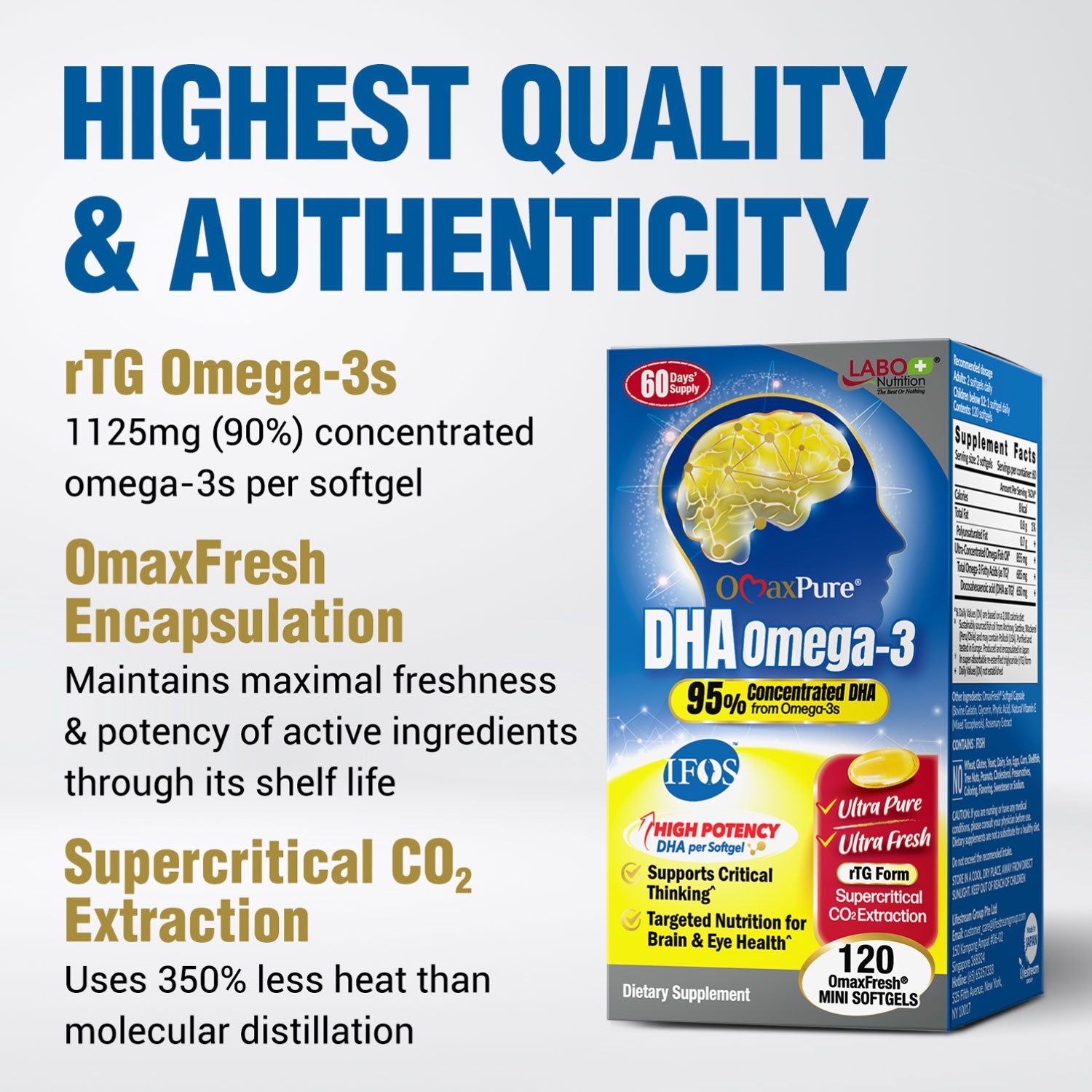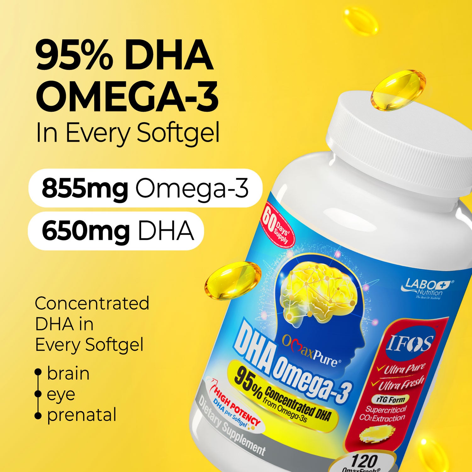 OmaxPure delivers 95% concentrated DHA from omega-3s in a highly absorbable rTG (re-esterified triglyceride) form—up to 70% better absorbed than standard fish oils.