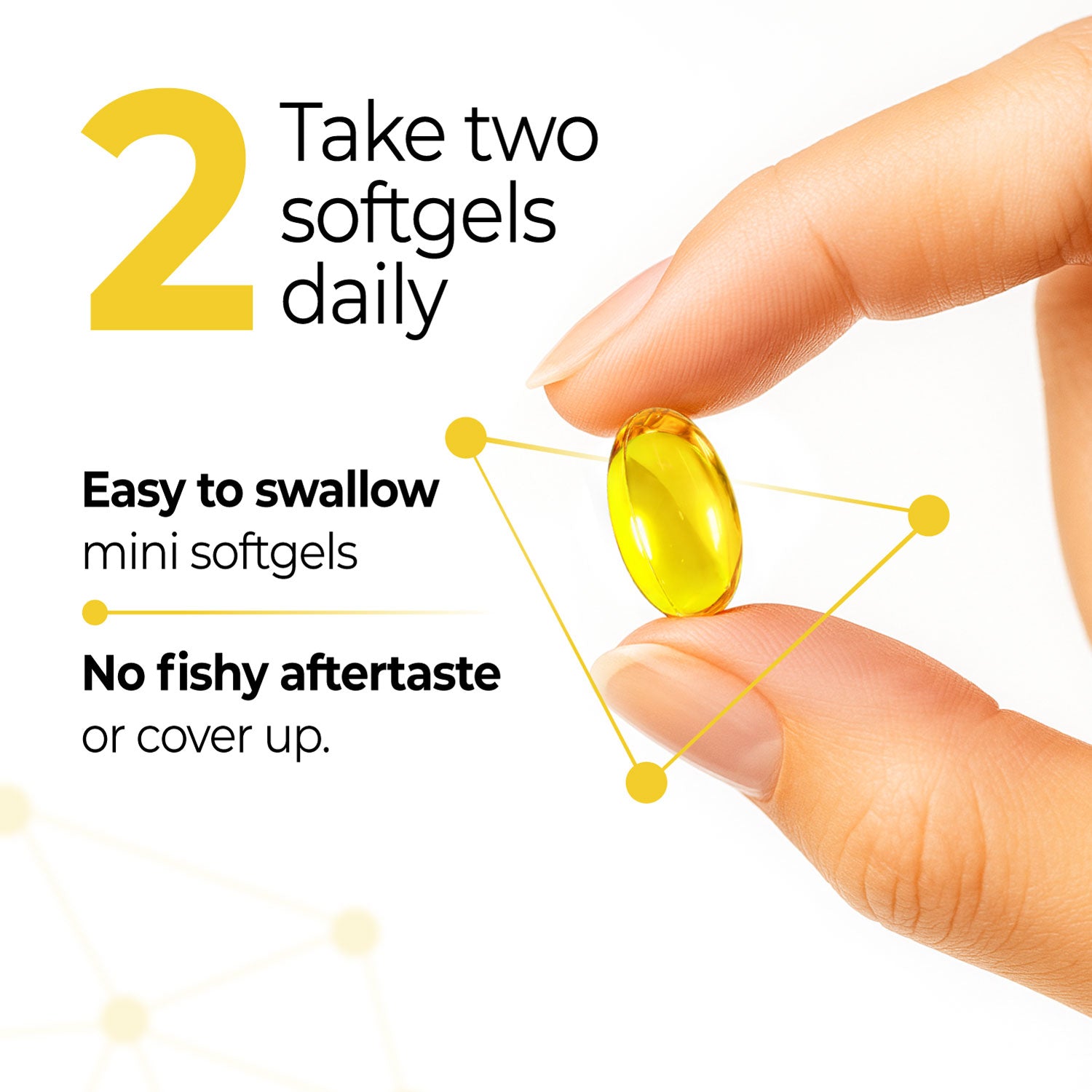 For Adults: Take 2 mini softgels daily. 1 bottle offers a 60-day supply.
