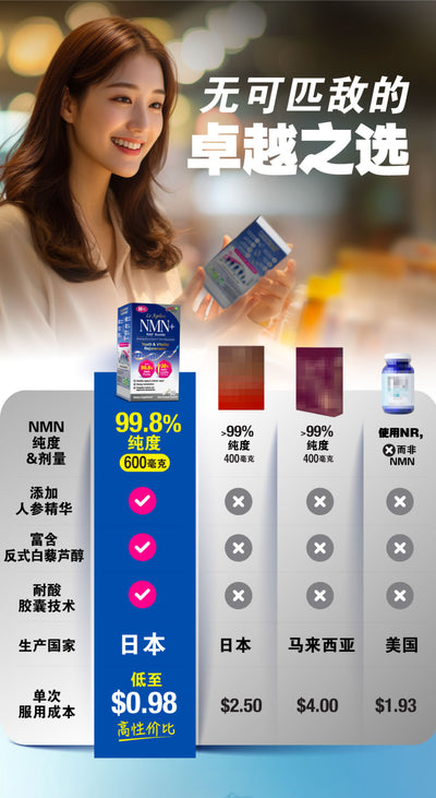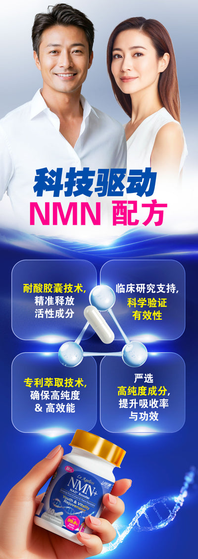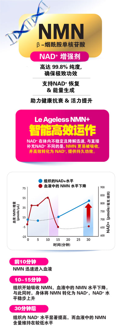 NR (Nicotinamide Riboside) and NMN (Nicotinamide Mononucleotide) are both used by the body to make NAD+, a key molecule that supports energy production and healthy cell function. When you take NR, your body needs to convert it into NMN before it can become NAD+. NMN, however, skips this step because it is already further along in the process (direct precursor). This is why Le Ageless NMN+ uses NMN — to provide a more direct and efficient way to support NAD+ levels in your cells.