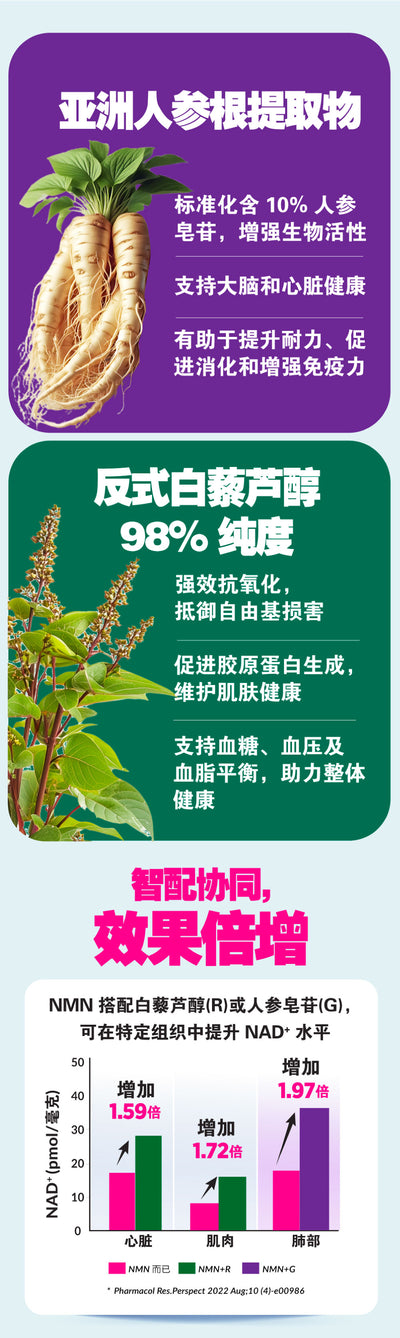 • 3-IN-1 SYNERGISTIC FORMULA FOR MAXIMAL NAD+ SUPPORT: More than just NMN — this advanced vegan-friendly formula includes Trans-Resveratrol for antioxidant protection and Ginseng Root Extract to help recycle NADH into NAD+. Together, they work in harmony to amplify your body’s natural NAD+ production up to 2 times more effectively.