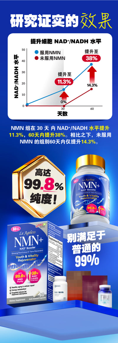 • SCIENCE PERFECTED NAD+ BOOSTER: Fatigue, brain fog, and poor sleep can suggest declining NAD+ levels. Le Ageless NMN+ is formulated to restore cellular energy by naturally boosting NAD+ by up to 38% in just 60 days. Third-party tested to verify up to 99.8% purity, it supports healthy aging, immunity, and overall vitality.