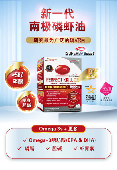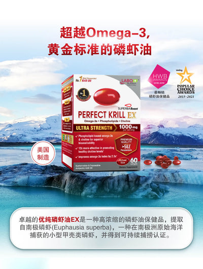LABO Nutrition Perfect Krill EX 优纯磷虾油EX、最纯净的南极磷虾油、最高磷脂含量 ( >56%)、胆碱和虾青素、Omega 3、辅助胆固醇、心脏和关节健康